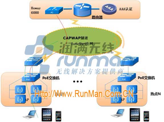 - 潤滿無線在給廣大需要無線覆蓋的客戶提供無線產品和無線解決方案的時候,經常會碰到客戶規模比較大,辦公地點比較分散,如果每個地方需要配置一個AC,這樣實施成本比較高.