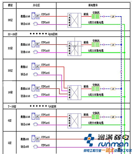 (5)設備間子系統:設在5層信息網絡機房,由總配線架、跳線及相關有源設備組成。采用24口智能配線架(水平端接、交換機跳接)、夾接式配線架(語音主干)、智能光纖配線箱(數據主干)、9針RJ45跳線和智能光纖跳線分別與主干、水平電纜連接與跳接。