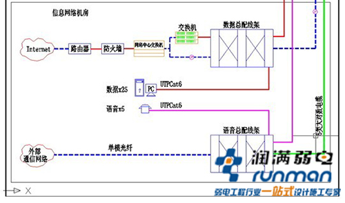 通過單模光纖接入市政通信網絡,在信息機房內通過光電轉換成大隊數電纜到樓層,采用虛擬組網。