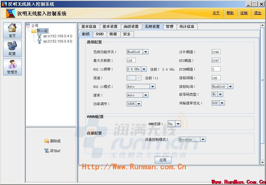 1、射頻參數(shù)配置:可對無線接入點的信道、802.11b/g/n模式、傳輸速率、流量控制等射頻參數(shù)進(jìn)行配置。