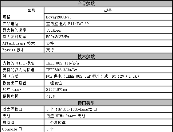 漢明科技自主研發的 Howay2000NVS 企業級室內增強型無線接入點設備,內置 533MHz 主頻射頻處理器,工作在 2.4GHz 頻段,支持802.11b/g/n 協議。采用 CCK/DSSS、OFDM、 MIMO 等調制解調技術,基于漢明科技的優化開發設計,Howay2000NVS 可提供最高150Mbps 的連接速率,相當于傳統 802.11b/g 網絡接入速率的 3 倍。
