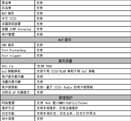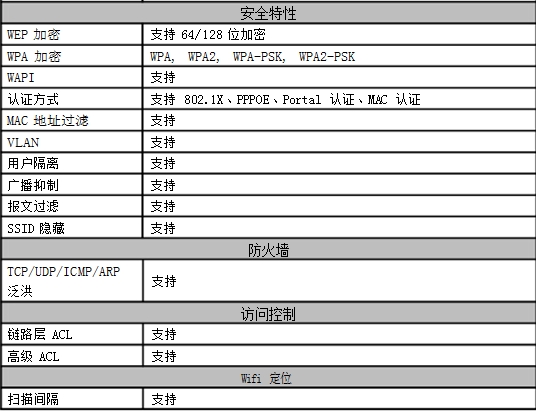 提供了豐富的網絡安全特性,支持 WEP、WPA、WPA2、WPA-PSK、WPA2-PSK 等無線 鏈路認證、加密方式。具有 SSID 隱藏、接入用戶隔離、MAC 地址過濾、防 ARP 攻擊、用戶 帶寬限制等多種安全策略。可結合后臺認證系統、計費系統、安全準入系統實現對用戶的接 入管理控制,有效保護無線網絡及接入用戶的安全。