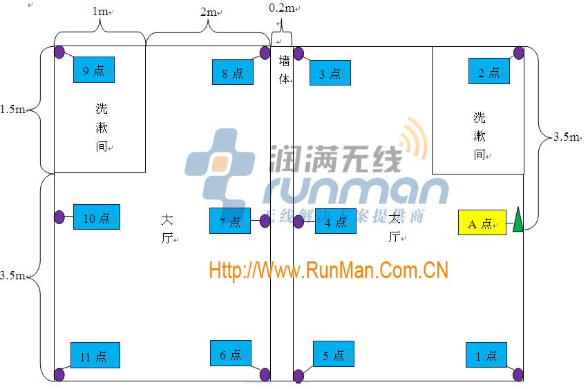 Howay2000NPv3 是通過漢明特有的射頻和天線優化算法,實現全向覆蓋,可以有效覆蓋2、3 個房間。某項目中用戶實測情況是:當AP 布置在如下圖中標準房間的“A 點”或者“4 點”位置,其它“1~11 點”位置均可到達信號強度-60dB 以上的效果,用戶流暢上網沖浪。