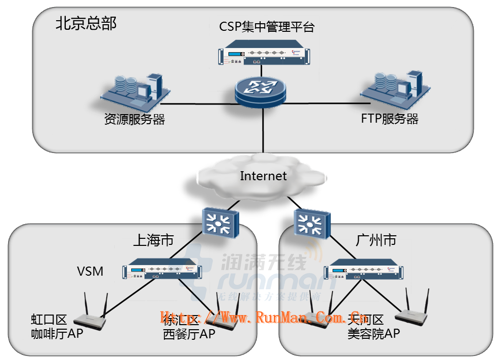 對于需要Wi-Fi覆蓋的商戶,僅僅需要投入AP設(shè)備,開通的條件是AP和CSP之間路由可達。如下拓撲圖所示,CSP部署在總部或IDC核心機房,AP跨互聯(lián)網(wǎng)與CSP相連,VSM負責(zé)所屬某個區(qū)域,AP數(shù)據(jù)可以通過AP本地轉(zhuǎn)發(fā),也可以通過VSM集中轉(zhuǎn)發(fā),策略統(tǒng)一由CSP下發(fā)分配,由VSM執(zhí)行。
