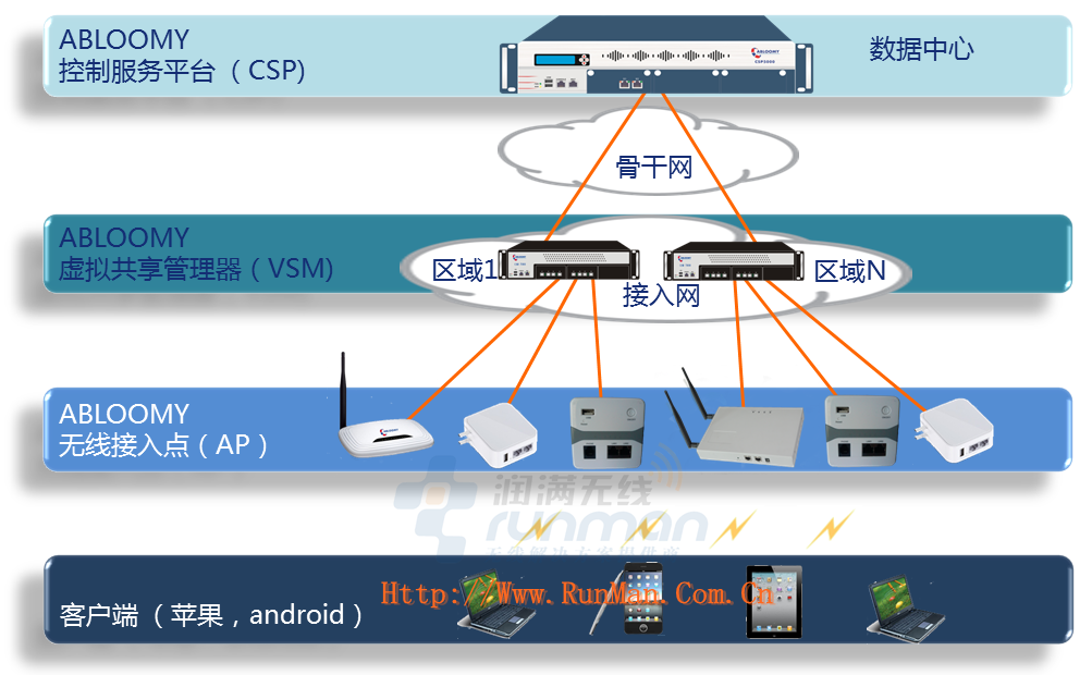 ABLOOMY無線解決方案跨越了局域網、廣域網和互聯網(NAT),利用這一方案構建統一管理的Wi-Fi網絡的唯一條件是AP和CSP之間IP路由可達,這一方案不再依賴于特定網絡接入媒介,可以在DSL、WiMAX、3G、4G、FTTH、Ethernet、CMTS、cable、小區寬帶等任何網路媒介上建網;這一方案的AP都是即插即用,在CSP統一管理下自動組網。用戶管理也跨越了局域網、廣域網和互聯網,在CSP的調下,企業和運營商的用戶管理可以擺脫設備及地域的限制。