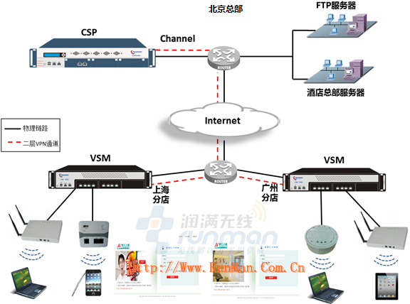 連鎖酒店全國規劃共建100多家經濟型酒店,共使用3臺CAM、10個VSM和若干個VAP。主要解決酒店本地無線覆蓋和形象宣傳,全國各地酒店服務器通過VPN統一管理等。其中CSP智能統一管理各分店的VAP,為分店簡介地推送獨立的不同的廣告頁面,定向投放精準營銷。CSP集中管理各分店AP的無線策略、射頻功率、信道策略和認證策略等。