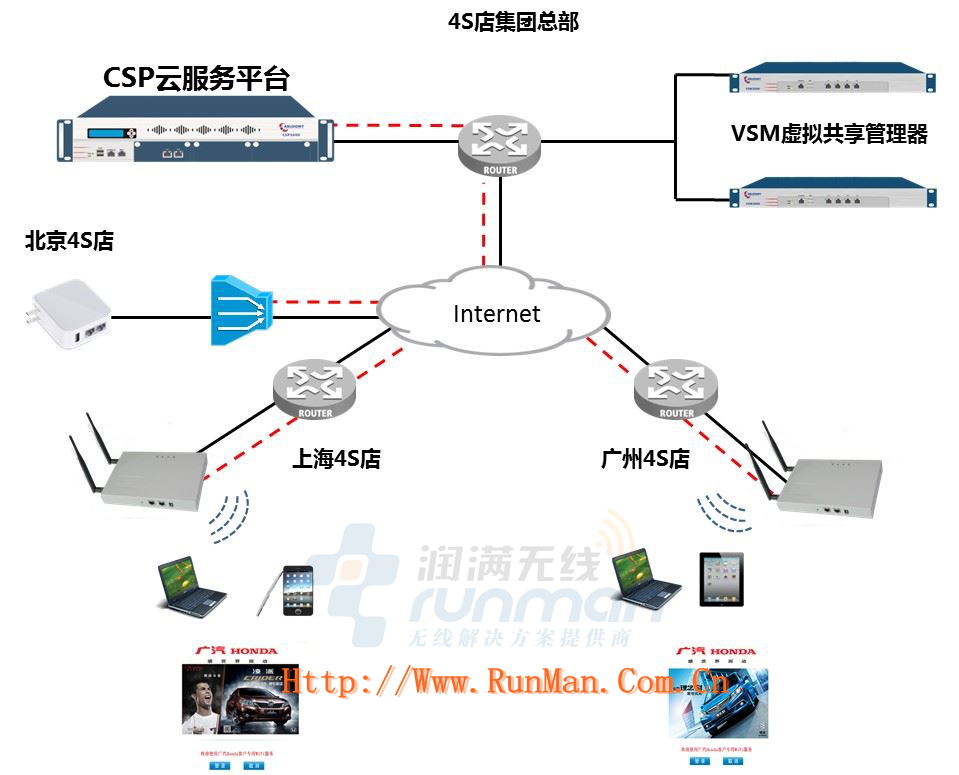 連鎖4S店全國共有500多家,共使用1臺CSP+2臺VSM+若干個VAP。其中CSP智能統一管理各分店的VAP,為分店簡介地推送獨立的不同的廣告頁面,定向投放精準營銷。CSP集中管理各分店AP的無線策略、射頻功率、信道策略和認證策略等。