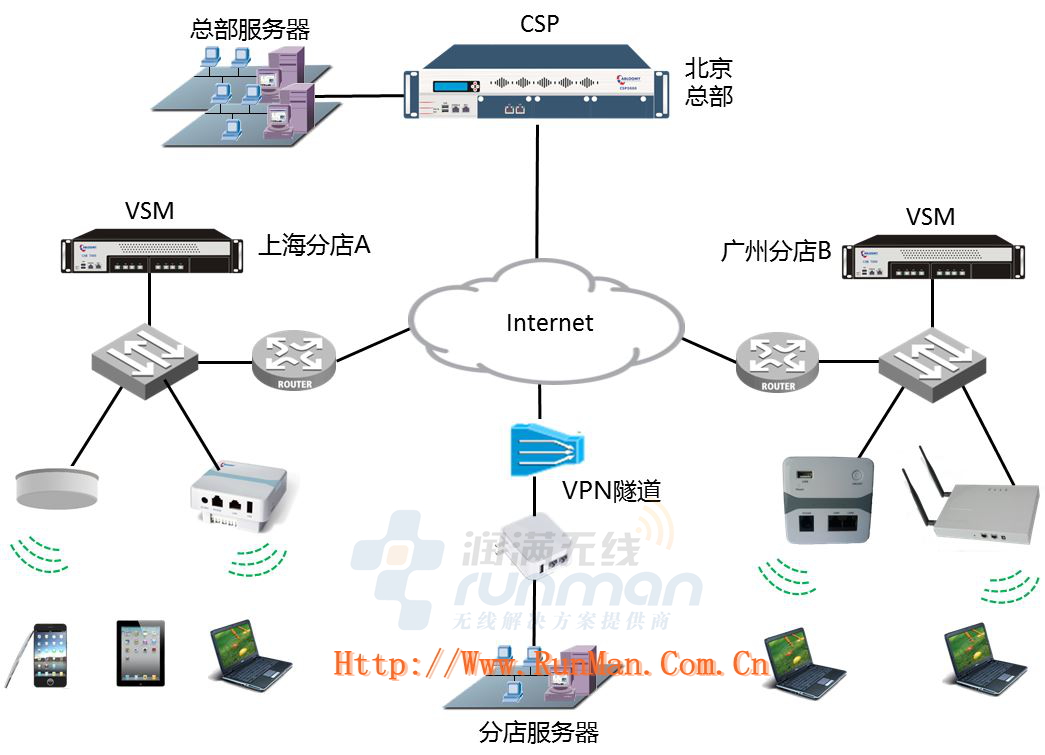 以CSP為核心云服務平臺,VSM為分布式接入控制器,對大范圍Wi-Fi熱點進行定向的、精準的覆蓋。