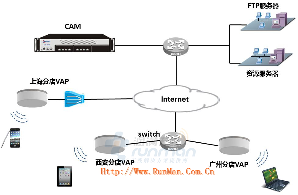 各分支機(jī)構(gòu)的AP可以與企業(yè)總部的AC建立VPN,實(shí)現(xiàn)企業(yè)有線網(wǎng)和無線網(wǎng)同步的安全擴(kuò)展。