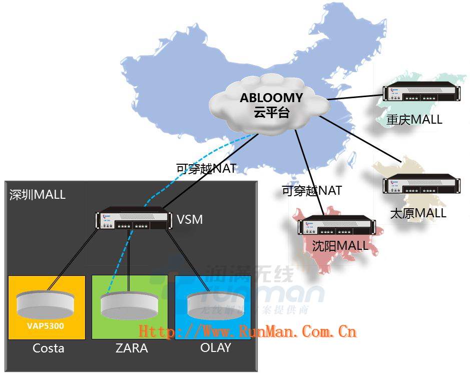 某商業(yè)集團(tuán)全國擁有超過25家超級廣場MALL,平均面積約50000平方米,MALL內(nèi)商店隔斷少,適宜部署吸頂式AP,且VAP5300覆蓋面積廣,能以高性價(jià)比全方位覆蓋大型MALL的每一個(gè)角落,給用戶高速無線上網(wǎng)的體驗(yàn),同時(shí)為全國MALL統(tǒng)一推送品牌宣傳。