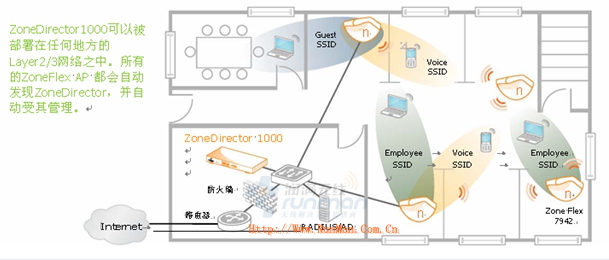 ZoneDirector可與現(xiàn)有網(wǎng)絡(luò)和安全架構(gòu)交互,并為所有AP提供動態(tài)射頻管理,而無需再考慮AP定位問題。