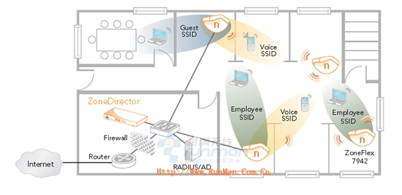 智能天線陣列讓AP定位不再是問題,而通過ZoneDirector的動態頻道指定以及發射功率管理功能,臨近AP之間的相互干擾也降到了最低。