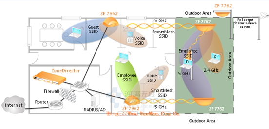 ZoneFlex 7762智能無線AP可以單獨模式部署,也可以由ZoneDirector統一集中管理。 ZoneFlex 7762也可以用SmartMesh進行部署,無需為每臺AP連接網線。7762可以與室內型雙頻11n產品7962對應,形成從室內延申到室外的無逢連接,不需要布網線,請看下圖: